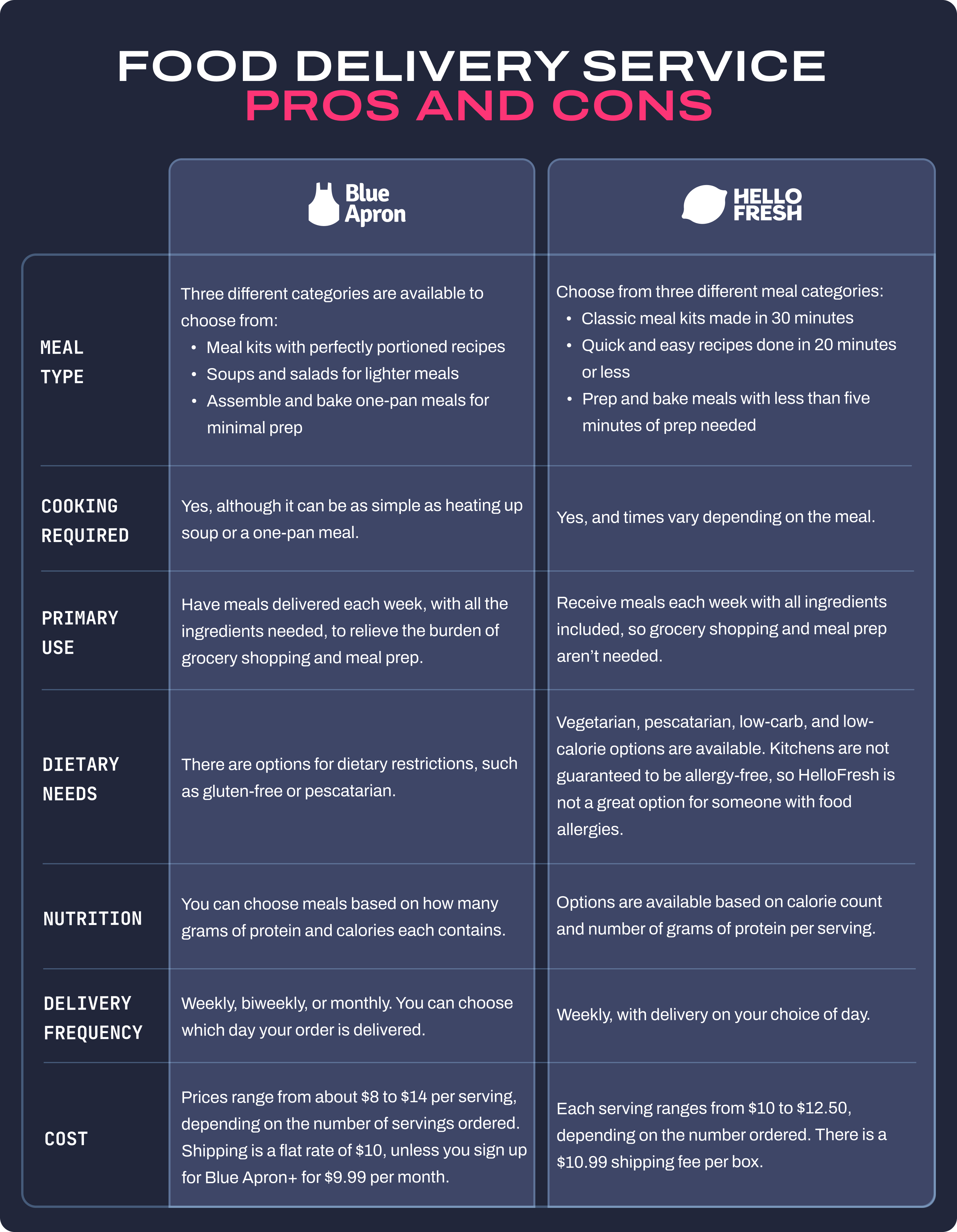 When comparing meal kits, there are certain factors to consider. To have a good experience with the service you choose, it needs to fit into your lifestyle.